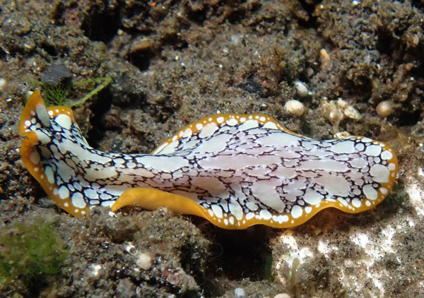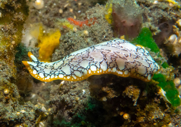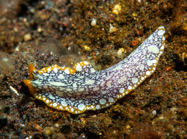 These appear to be specimens of the somewhat variable Pseudoceros scintillatus, although they also resemble what Newman & Cannon call Pseudoceros sp. 18 and the ID is controversial. Specimens we saw in the Philippines range from typical coloration to ones that look like these below. Those below were photographed at Pura Segara, Melasti and Seraya.