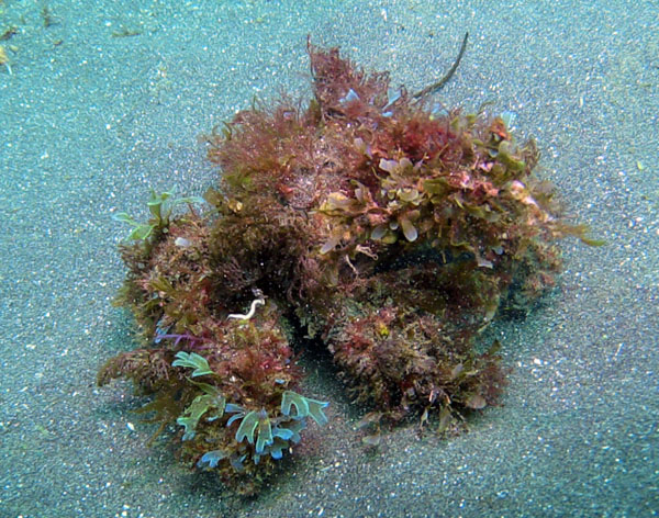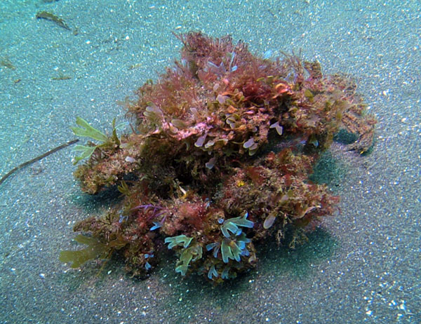 This decorator crab was spotted crawling on the sand but quickly climbed onto a kelp holdfast to better camouflage itself. Anacapa Island.