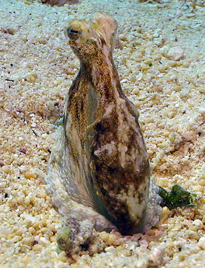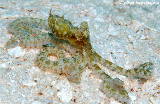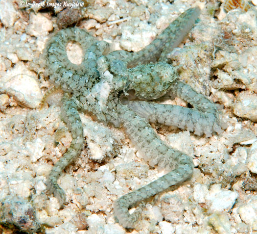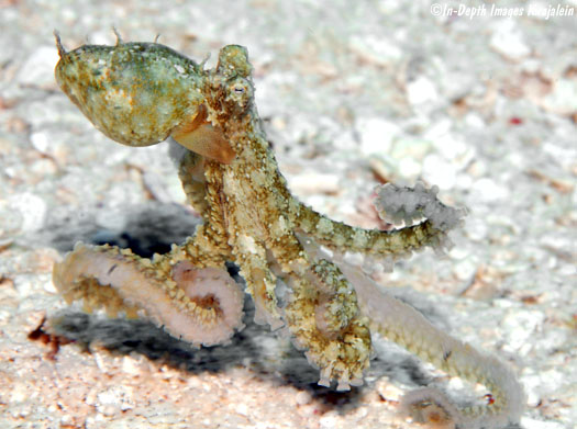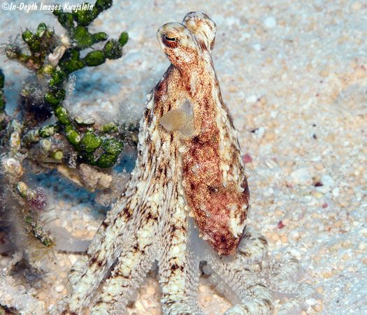 These appear to be Abdopus abaculus, one of the long-armed octopus. They were most often observed in sandy areas and algae patches on lagoon reefs, but could also be found in sand channels on the seaward reef.