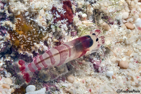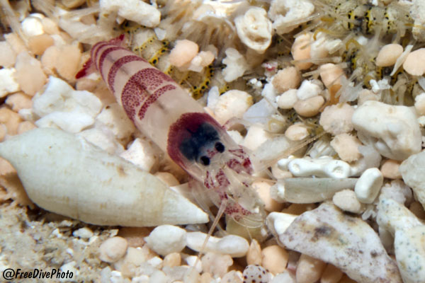 This shrimp was found and photographed by John and Lynette Flynn at Majuro Atoll. Specimens from Australia (Gosliner et al (2016)) and Indonesia (Anker et al (2015)) have the same pattern although the colors of the bands are bright red rather than maroon. The Majuro individual could be a slight variation from the northeastern edge of its range.
