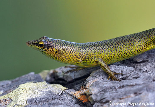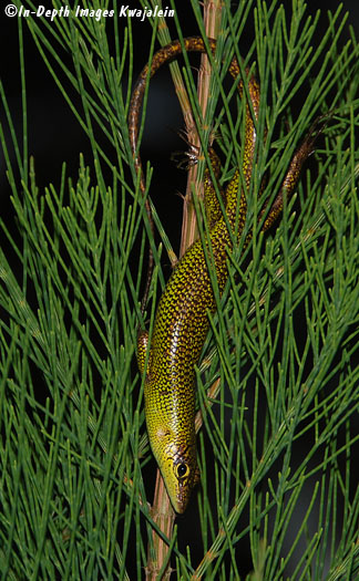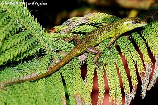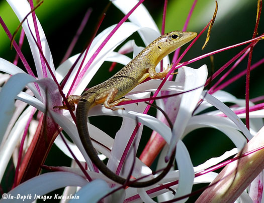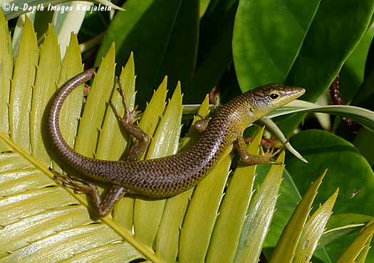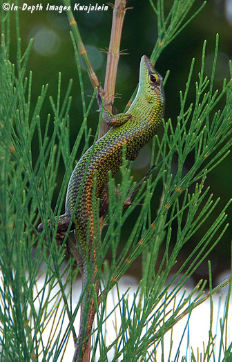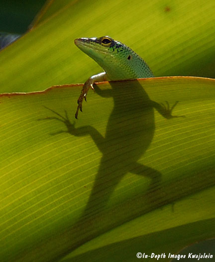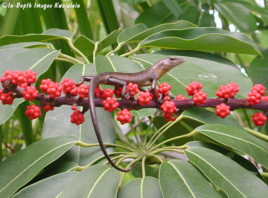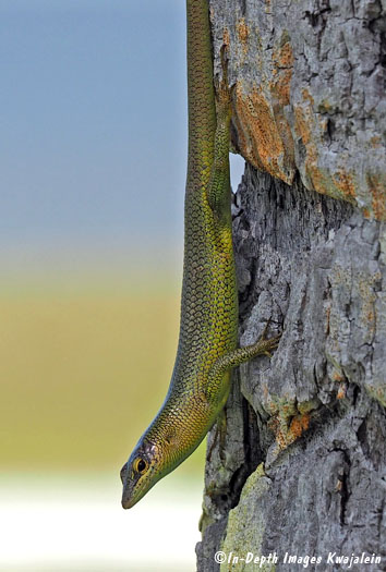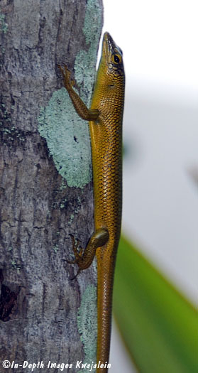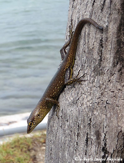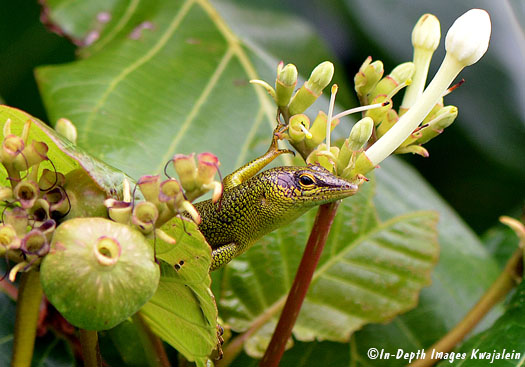 Although I do not remember them from my Kwajalein tours in the 1960s and 1970s, Emerald Tree Skinks are now common on the island. This skink is relatively large and can vary its own color from green to brown, depending on its background. It is reported to eat insects, although we have also seen them apparently licking sap from flowers. They seem most often to be seen on the trunks of coconut palms, and if approached by a person they will circle around to keep on the opposite side of the tree, spiraling upward to get out of reach.