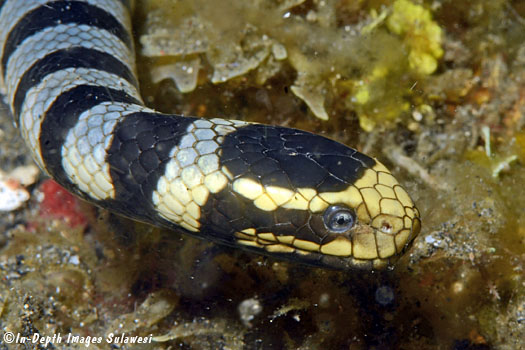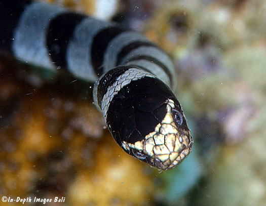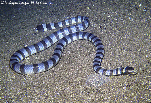 Laticauda colubrina is common relatively common around islands in the western Pacific. We have personally seen it in Indonesia, the Philippines and the Solomon Islands. Nearly all of the anecdotal reports of sightings in the Marshall Islands are probably cases of mistaken identity; those we have been able to try to verify through pictures or specimens have all turned out to be the banded snake eel, Myrichthys colubrinus. Although we have not seen the specimen, one was reliably reported captured and preserved at Majuro Atoll.