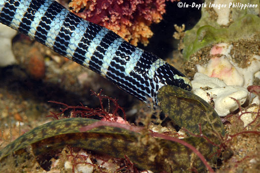 Laticauda colubrina swallowing one of its favorite prey, a moray eel.