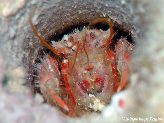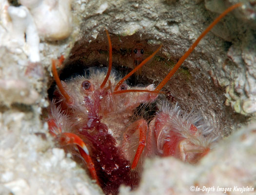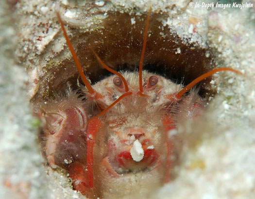 This lives in rather smooth holes on the seaward reef. The holes are common, but only occasionally do you see the shrimp looking out. They will sit at the hole's opening and grab drifting chunks of algae, which they will pull back into their hole, reappearing quickly to wait for more. You can "feed" them by dropping strands of Asparagopsis algae next to the hole as in the second photo below.